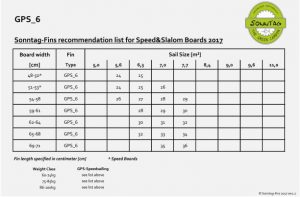 For speed sailing we recommend to chose a 1-3cm smaller GPS_6 than you are used to sail with a slalom fin. So i.e. for the classical medium slalom board (68-71cm wide) with 7.0-7.8m² we recommend a 35-36cm GPS_6 when sailing in light chop or flat water conditions. If doing off-shore speed sailing and flying over/through 1-2m swell you need to go for 1-2cm longer GPS_6 than in the light chop conditions mentioned before. For the boards tested we were able to shift the mast foot a bit backwards still sailing the boom at a high position without negative effects on board control. This is giving you better speeds by less wet surface area.